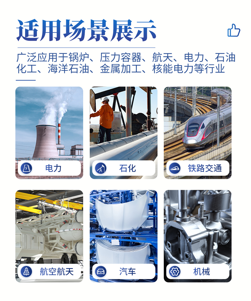 超聲波探傷儀器能夠便捷、準確地進行工件內部多種缺陷如裂紋、焊縫、氣孔、砂眼、夾雜、折疊等的檢測、定位、評估及診斷,廣泛應用于電力、石化、鍋爐壓力容器、鋼結構、航空航天、鐵路交通、汽車、機械等領域。它是無損檢測行業的儀器。