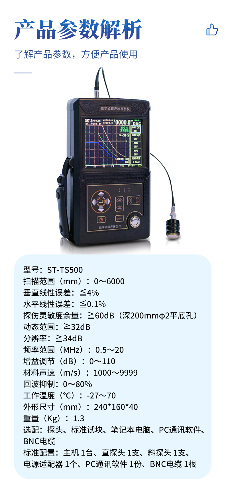 超聲波探傷儀器能夠便捷、準確地進行工件內部多種缺陷如裂紋、焊縫、氣孔、砂眼、夾雜、折疊等的檢測、定位、評估及診斷,廣泛應用于電力、石化、鍋爐壓力容器、鋼結構、航空航天、鐵路交通、汽車、機械等領域。它是無損檢測行業的儀器。主要功能● 自動校準探頭,不需要手動計算;● 利用標準試塊自動生成