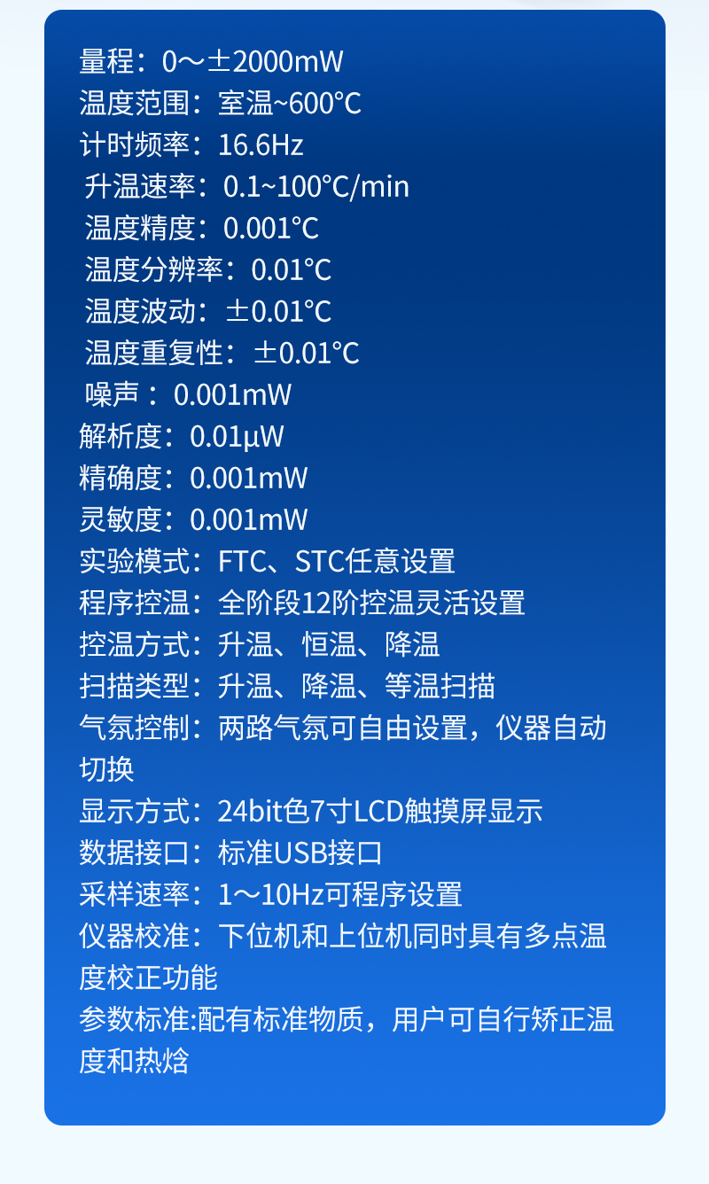 22、 參數(shù)標(biāo)準(zhǔn):配有標(biāo)準(zhǔn)物質(zhì),用戶可自行矯正溫度和熱焓