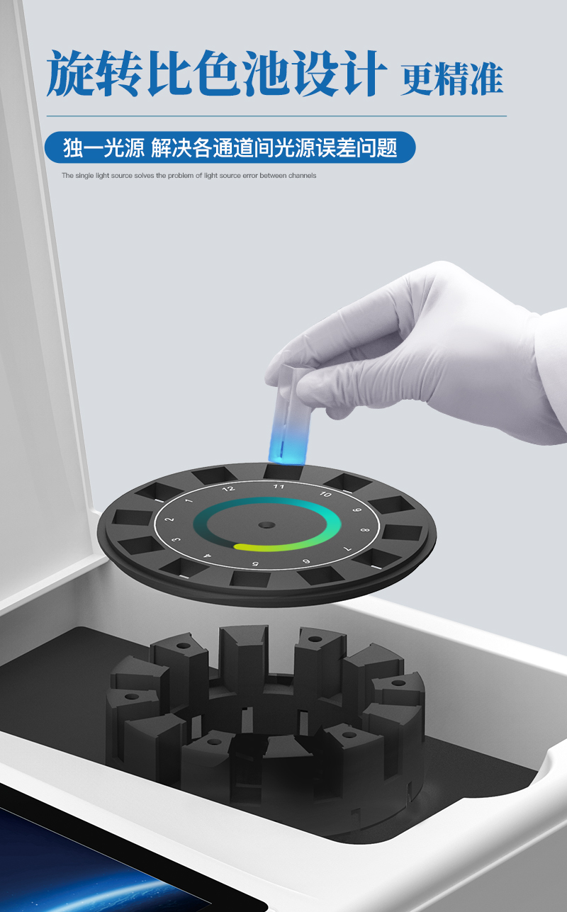 4、檢測通道:≥12通道;采用精密旋轉比色池設計,使用同芯片同光源校準精度,解決不同光源之間的誤差值,更加準確高效。
